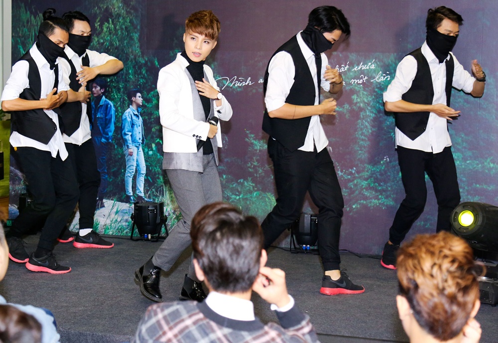 | Á quân The Voice mùa hai tự tin vừa hát vừa khoe vũ đạo trong họp báo. |