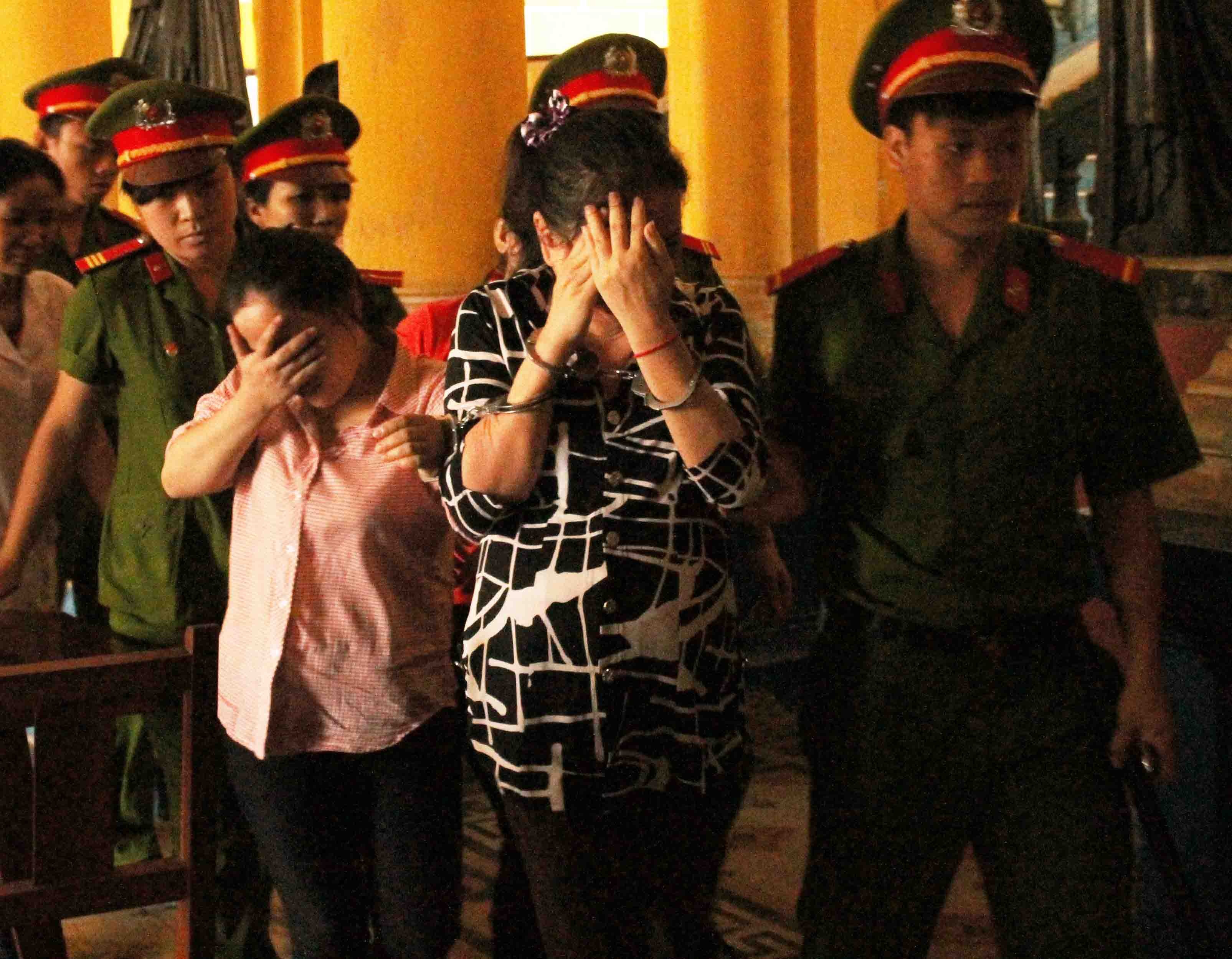 | Thanh (phải) và Thuy che mặt khi bị dẫn giải về trại giam. |