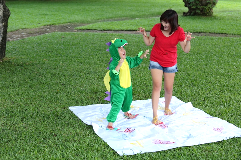 | Hai mẹ con mày mò làm 2 đôi chân khủng long bằng mút xốp như chỉ dẫn của trò Dấu chân khủng long, thêm bộ quần áo nữa là cu cậu không khác gì chú khủng long con thật đáng yêu. Tuy chuẩn bị nhiều thứ, chơi xong người dính đầy màu vẽ nhưng mỗi bước chân con đi là mình giải thích thêm về lịch sử các loài khủng long, con tò mò, thích nghe, thích tìm hiểu thế giới các loài động vật hơn. |