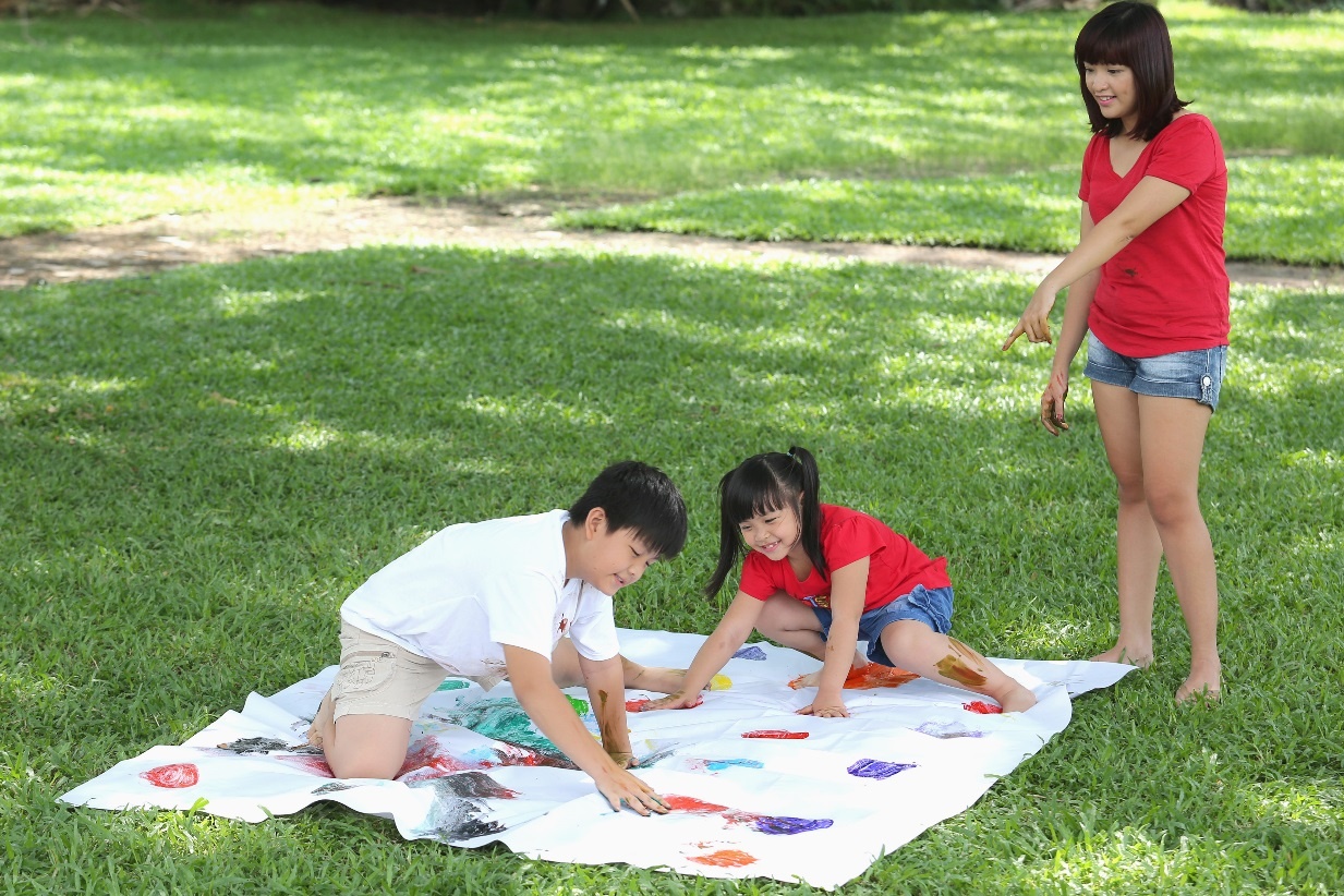 | Tin và Tina thích ra ngoài công viên chơi nên mình để 2 cháu chơi trò “Bàn cờ đa sắc” luôn. Đọc hiệu lệnh xong là 2 cô cậu chân tay xoạc tới xoạc lui cho đúng ô màu, nhiều tư thế vui. Chơi xong về mẹ nhận không ra luôn nhưng mình thấy đây là một trò chơi hay, giúp bé phân biệt màu và luyện khả năng quan sát vì phải nhanh tay nhanh chân chọn đúng ô màu theo hiệu lệnh. |