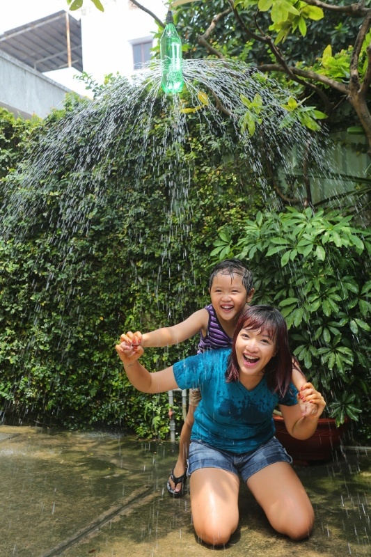 | Ở nhà có chai nước cũ không biết làm gì nên mình vào Kho tàng trò chơi OMO xem có tận dụng được không. Sau một hồi dùng kim chọc chi chít lỗ trên chai, nhét ống nước vào, con đã có một “vòi sen nhân tạo” tắm thỏa thích ngay sân nhà. Thích nhất là con không sợ nước, cứ cười mãi. Chơi trò Cơn mưa dịu mát này xong là 2 mẹ con “không còn chỗ nào để ướt” nhưng thấy con vui thì mình vui lây. |