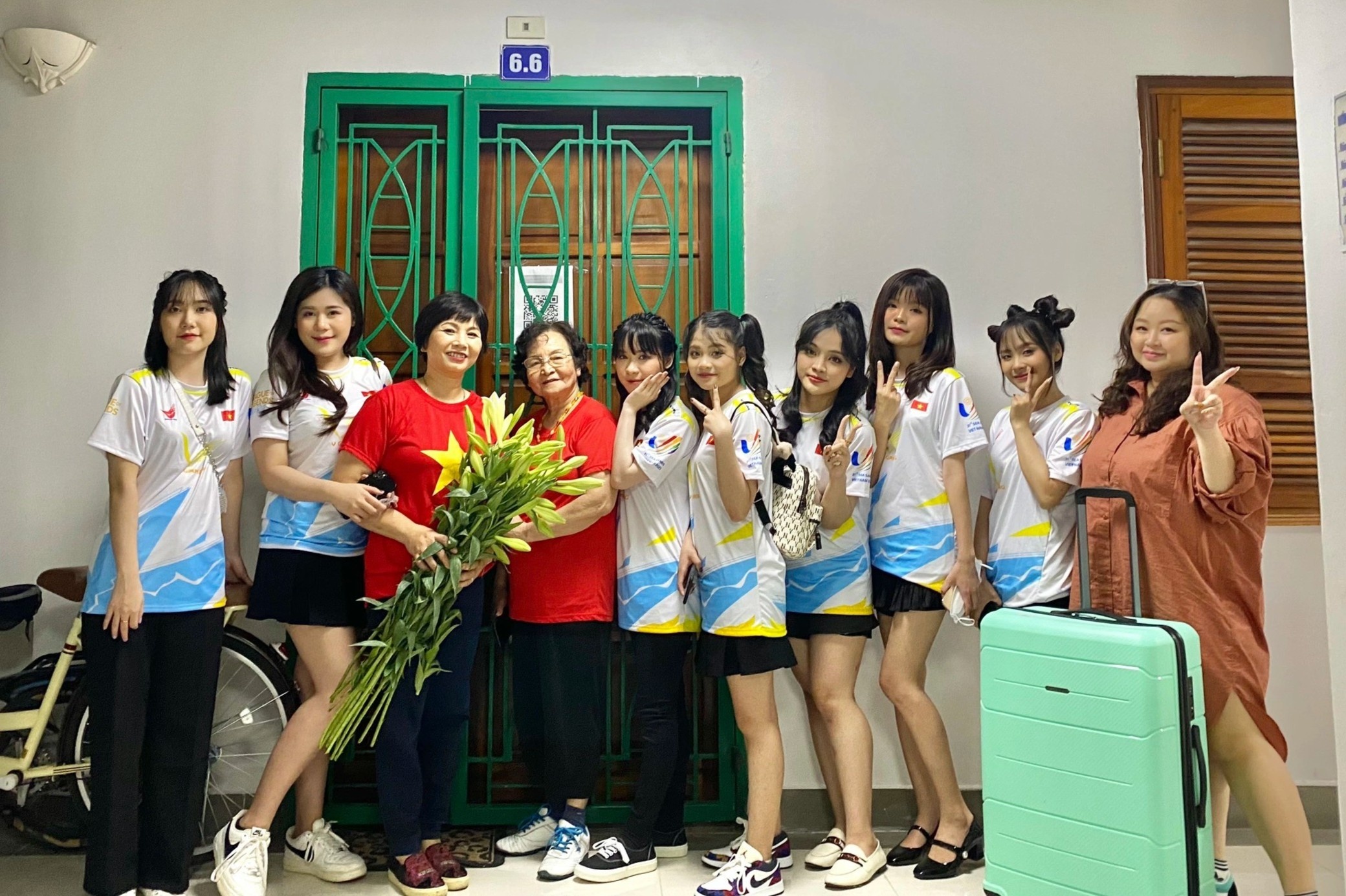 Cô Dương và bà Liên chụp ảnh kỷ niệm cùng tuyển nữ tốc chiến Việt Nam. Ảnh: NVCC. |