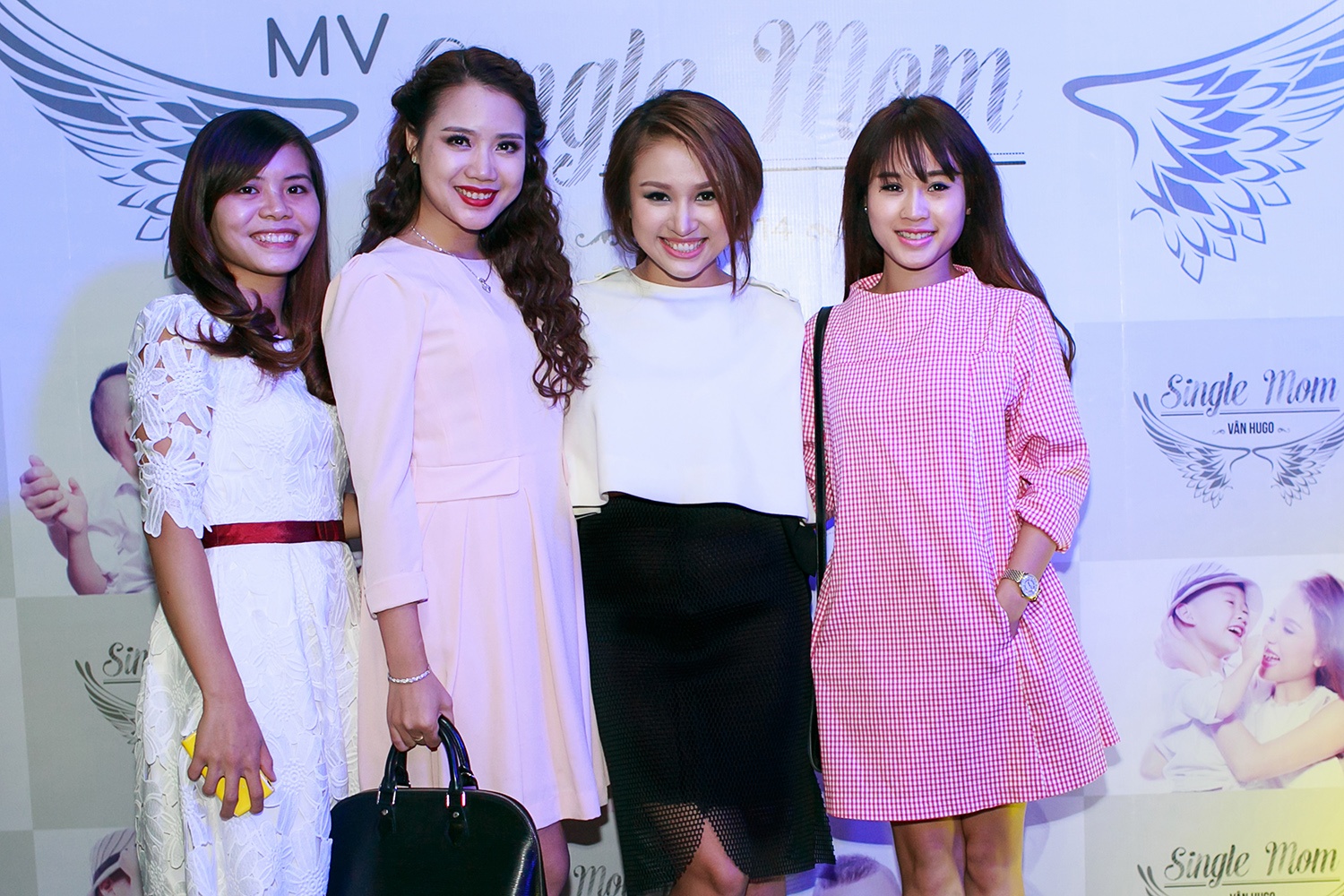 | Diễn viên Lan Hương (thứ hai từ trái sang) và Diễm Hằng (phải) đến ủng hộ sản phẩm mới của Vân Hugo. Thực hiện MV Single mom lần này, bà mẹ đơn thân cho biết, cô không muốn lấn sân sang lĩnh vực ca hát mà chỉ đơn giản là làm một sản phẩm để kỷ niệm cùng con trai và chia sẻ nỗi niềm với nhiều bà mẹ khác. |