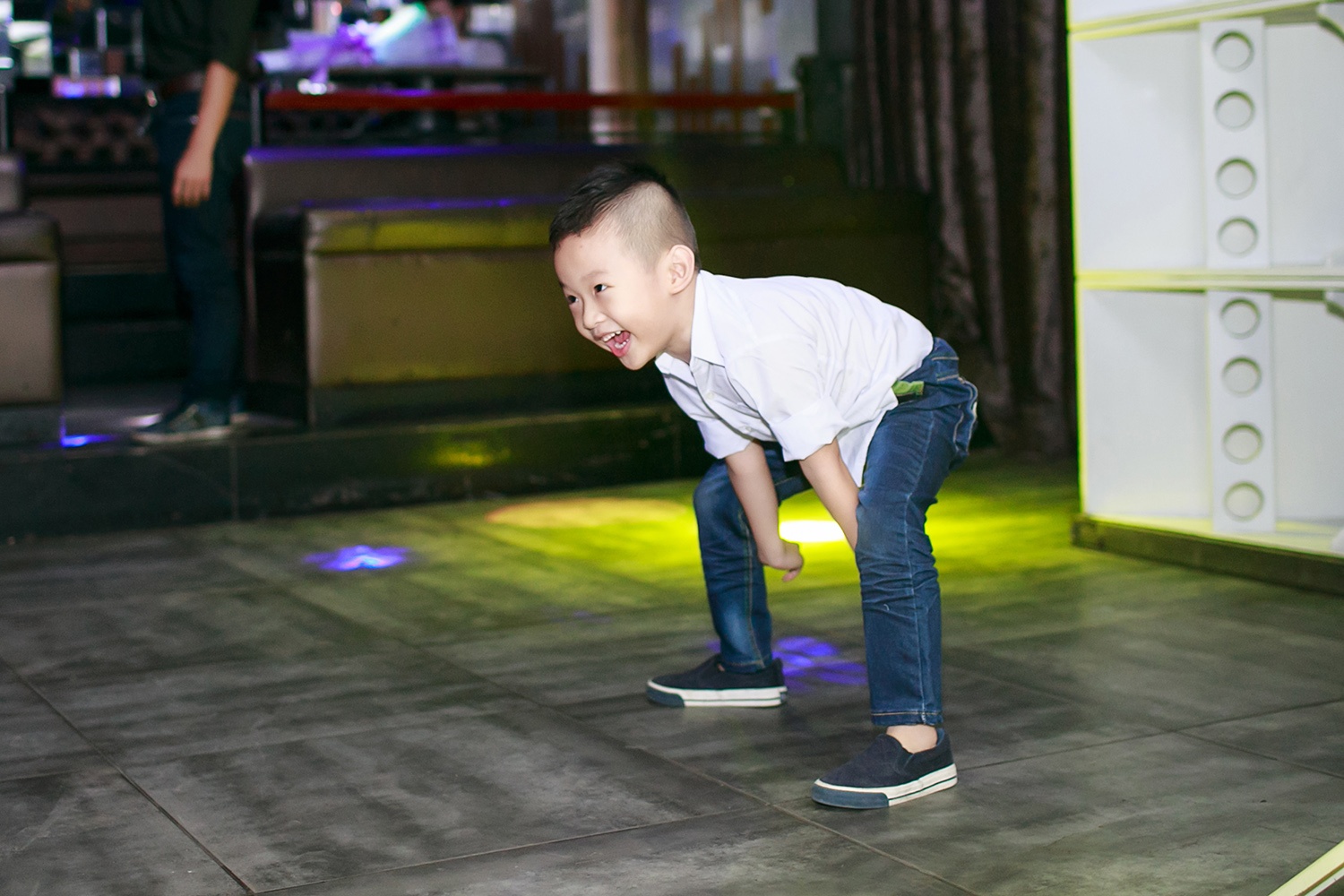 | Bé Bin - con trai của Vân Hugo - hiếu động trong buổi họp báo MV. Cậu bé năm nay đã 5 tuổi, chuẩn bị vào học lớp 1. |
