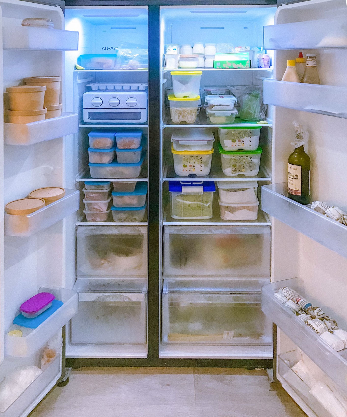 Ngăn trên cùng để sữa chua úp ngược tự làm, sữa chua Hy Lạp, một ít sữa, men tiêu hóa. Thông thường, ngăn dưới để trái cây, kệ tiếp theo là đồ ăn đã nấu chín.