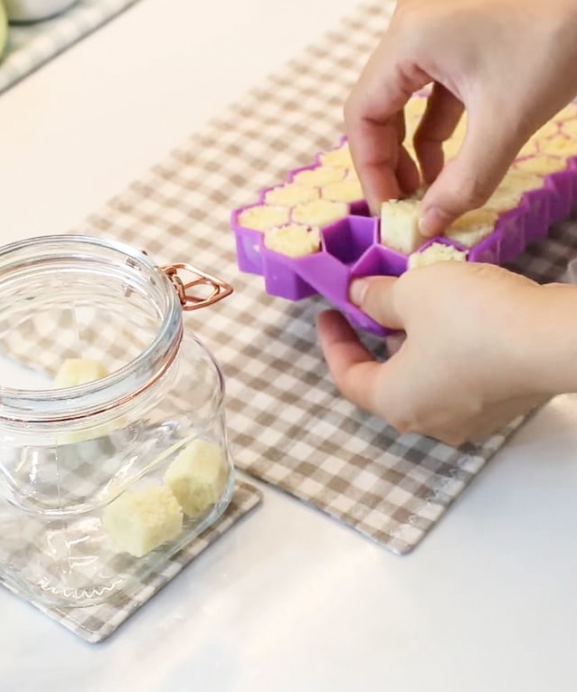 Tỏi rửa sạch, thấm khô hết nước. Bạn xay nhuyễn nguyên liệu này rồi cho vào khay đá có nắp, để tủ đá 4 tiếng. Cuối cùng, cho viên tỏi vào lọ thủy tinh, tiếp tục bỏ ngăn đá.