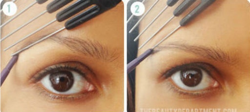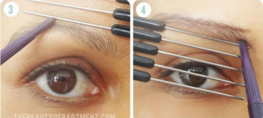 Nếu như không có khuôn mẫu để vẽ, bạn có thể tham khảo cách kẻ mày sau. Chuẩn bị một chiếc lược có phần cạnh thẳng như hình vẽ, nếu không có loại lược này, bạn có thể lựa chọn một vật có đường thẳng để căn chỉnh, một chì kẻ lông mày, gel, phấn kẻ và cọ đầu mảnh.