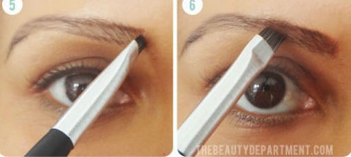 Dùng cọ lấy một ít bột phấn màu nâu, tô lông mày theo đường vẽ. Đánh đầu cọ theo hướng chếch lên trên, dần dần về phía đỉnh cong của lông mày.