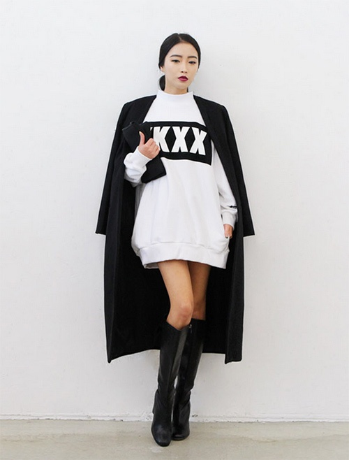| Áo khoác oversize dạ đen không hề làm bạn già hơn tuổi nhờ cách mix với boot cao cổ và váy nỉ in chữ trẻ trung. |
