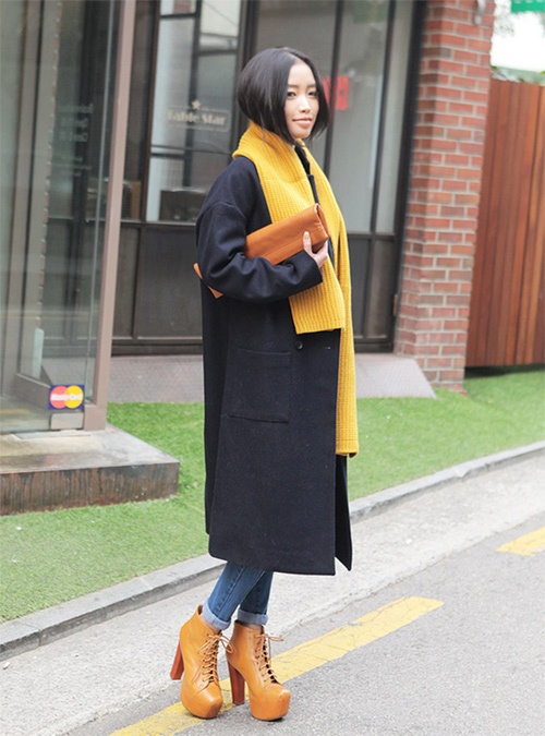 Cũng với áo khoác dạ đen, cô bạn gái này đã tạo sự trẻ trung bằng đôi boots và khăn len mang màu vàng rực rỡ.