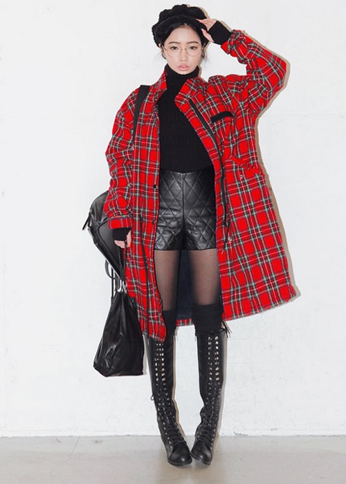 Một gợi ý cho cô nàng cá tính với áo dạ kẻ caro rực rỡ mix kèm boots và short da.