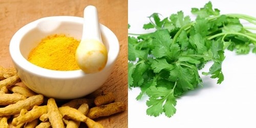 | Tạo hỗn hợp gồm lá rau mùi (ngò) và bột nghệ. Thoa nhẹ nhàng lên da khoảng 15 phút, sau đó rửa sạch với nước. |