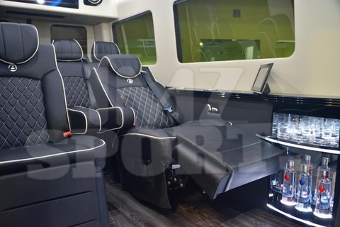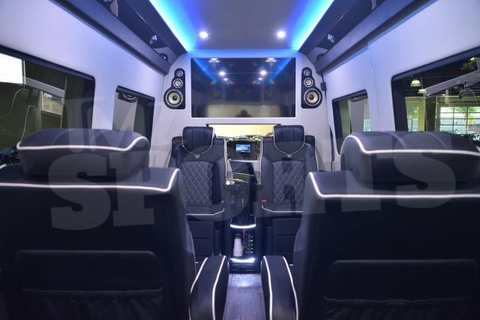 Chiếc xe buýt màu đen được trang bị màn hình TV 55 inch, gắn truyền hình trực tuyến của Apple, cùng hệ thống âm thanh vòm stereo. Xe cũng được trang bị quầy champagne, ghế massage tương tự xe siêu sang Maybach và hệ thống chiếu sáng cabin bắt mắt.