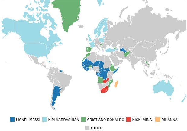 Xét về mức độ nổi tiếng, Cristiano Ronaldo được đánh giá nhỉnh hơn đồng nghiệp khoác áo Barcelona. Tuy nhiên, từ khóa “Ronaldo” chỉ đứng đầu tìm kiếm ở 18 quốc gia, bao gồm Tây Ban Nha, Bồ Đào Nha, Lào… và xếp ở vị trí thứ ba sau Kim Kardashian, ngôi sao truyền hình thực tế Mỹ (21 quốc gia).