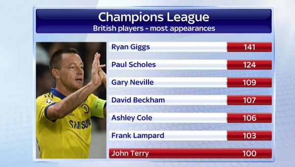 5. John Terry - Cầu thủ người Anh thứ 7 đạt 100 trận ra sân tại Champions League.