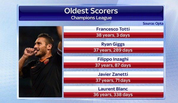 3. Francesco Totti - Cầu thủ nhiều tuổi nhất ghi bàn tại Champions League.