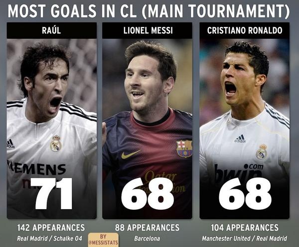 | Pha lập công gỡ hòa cho Barcelona ở phút thứ 12, cuộc so tài với PSG đêm qua giúp Lionel Messi nâng tổng số bàn thắng của anh tại đấu trường Champions League lên con số 68, ngang bằng thành tích với Cristiano Ronaldo và chỉ còn kém bậc tiền bối Raul Gonzalez vỏn vẹn 3 bàn. Tuy nhiên, siêu sao người Argentina lại trở thành cầu thủ đầu tiên trong lịch sử đạt đến cột mốc trên khi khoác áo một CLB duy nhất. Ngoài ra, pha dứt điểm tung lưới thủ thành Sirigu của Leo cũng chính là bàn thắng thứ 500 của Barcelona tại đấu trường danh giá nhất châu Âu. |