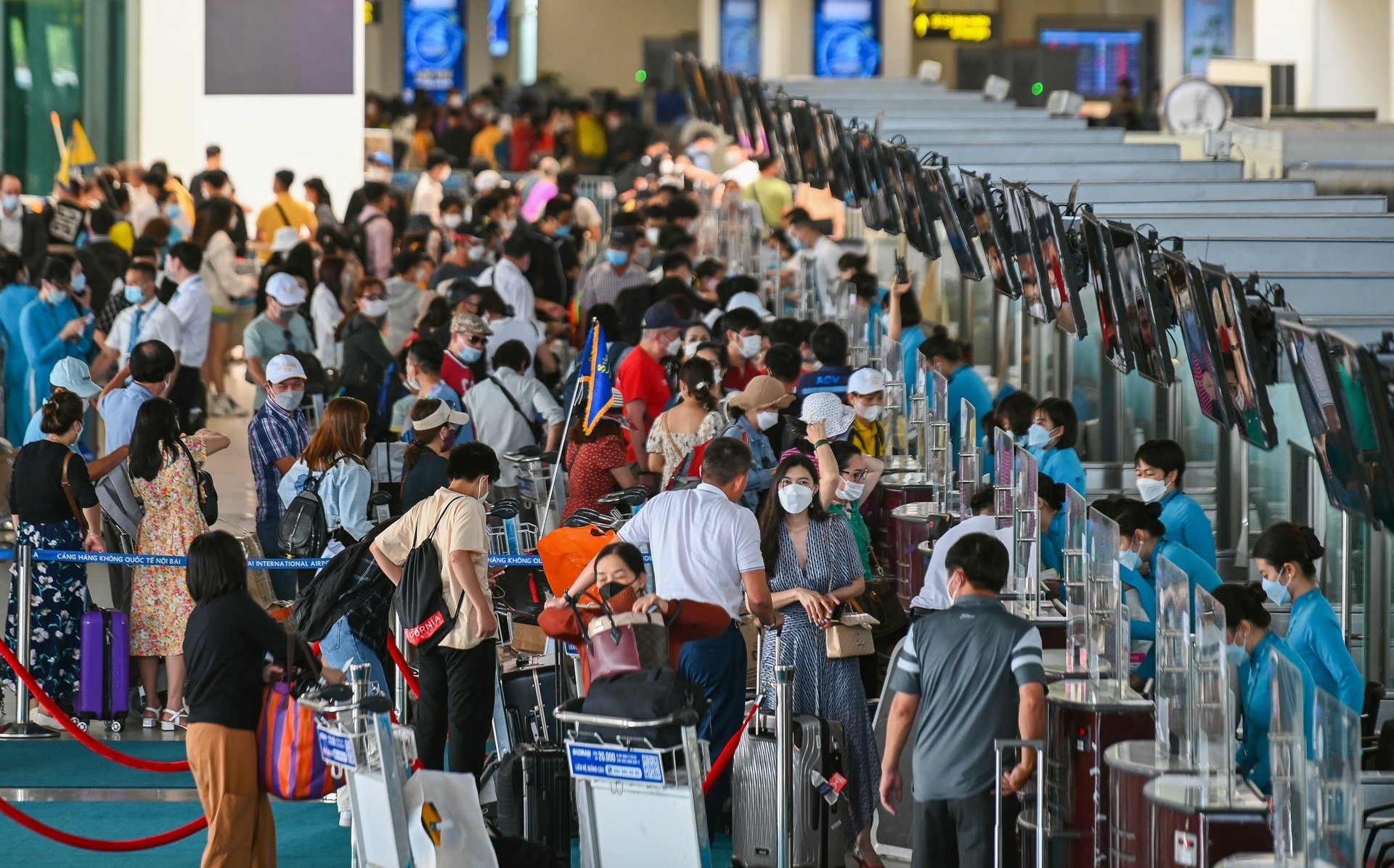 Số lượng hành khách đến sân bay Nội Bài (Hà Nội) cũng tăng hơn 40% so với cao điểm hè 2019, vượt quá công suất thiết kế của nhà ga hành khách T1.