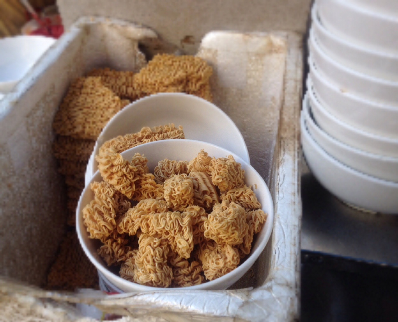 | Thùng xốp cũ kỹ đựng mì tôm đã bóc sẵn. |