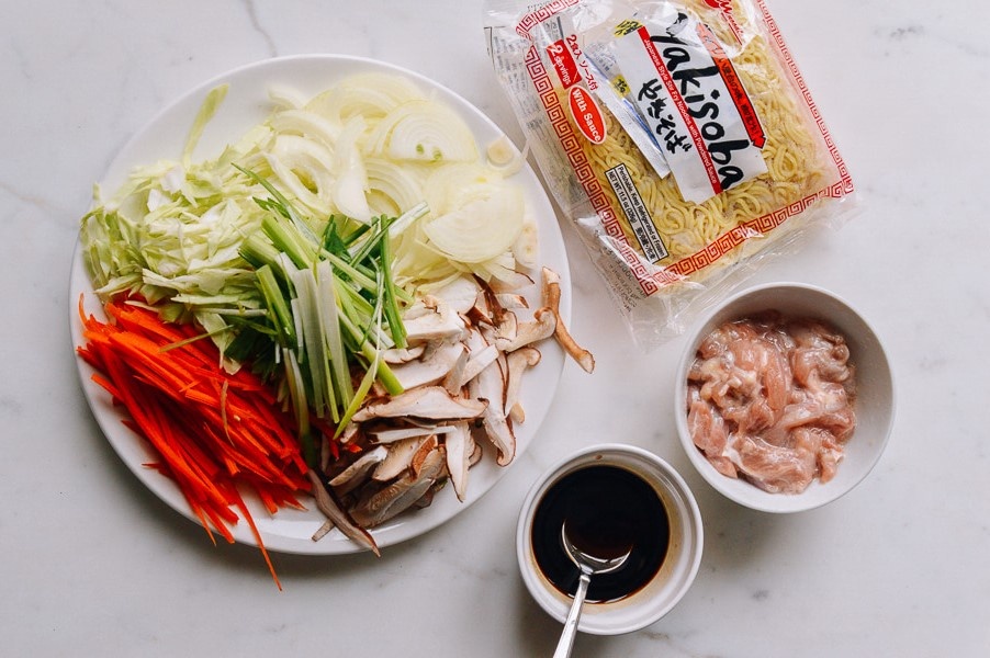 Cho tiếp 2 thìa dầu ăn vào chảo và xào nấm, sau 2 phút cho thêm hành tây, cà rốt, bắp cải đảo đều. Sau đó, cho thêm mì, thịt gà, hành lá và hỗn hợp nước xốt.