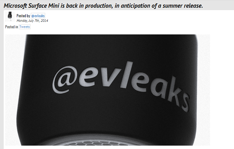 Những tin đồn trước đó cho rằng Surface mini sẽ sở hữu màn hình kích thước 7,5 inch và có bút cảm ứng đi kèm, hỗ trợ người dùng ghi chú tốt hơn. Với kế hoạch ra mắt vào mùa hè (nếu thông tin của @evleaks là chính xác), nhiều khả năng Surface mini sẽ lộ diện vào cuối tháng 8.
