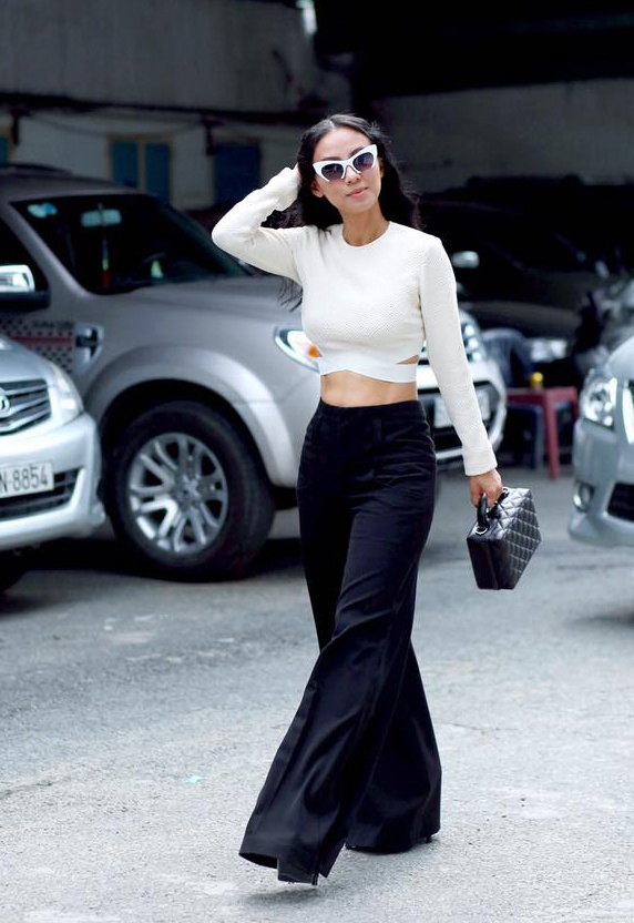 MC Huyền Ny chọn áo crop-top khoe eo thon kết hợp cùng quần suông rộng, mang đậm phong cách thập niên 1970.