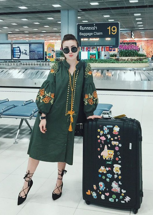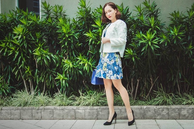Lan Phương trẻ trung dạo phố với váy họa tiết, áo khoác crop-top đính hoa 3D nổi bật và tinh tế.