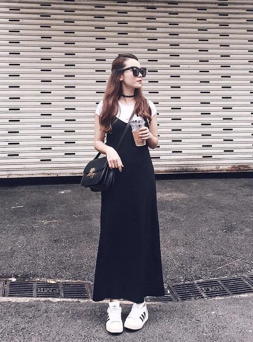 Trong khi đó, "Én chị" trẻ trung với váy yếm phối áo thun trắng, giày bata hiện đại.
