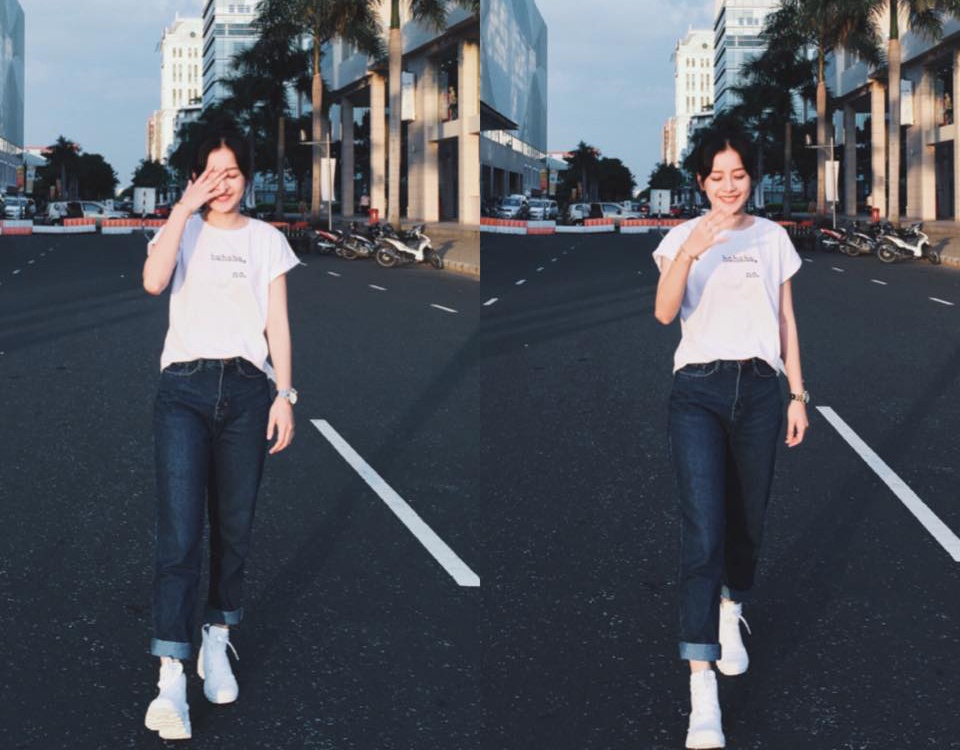 Trên trang cá nhân, Chi Pu đăng hình ảnh mới với phong cách trẻ trung, áo thun phối quần jeans, giày bata ăn ý.