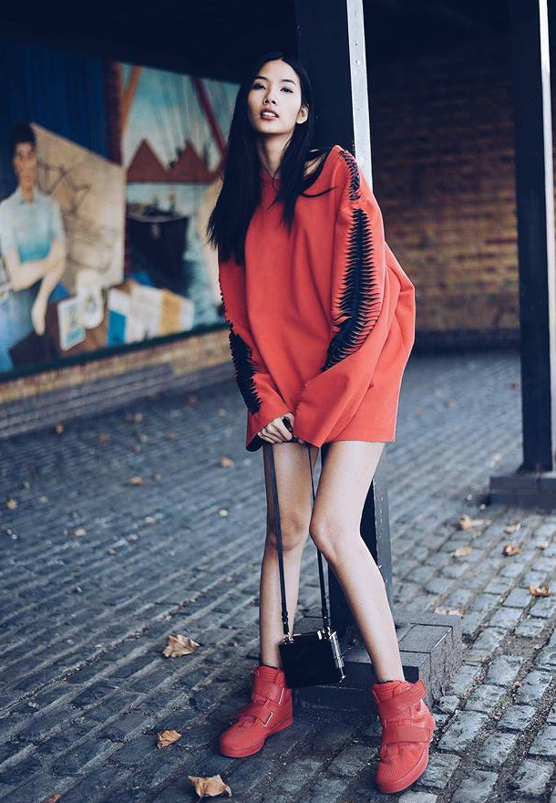 Hoàng Thùy cá tính với áo nỉ phom suông rộng, phối cùng giày bata ton sur ton.