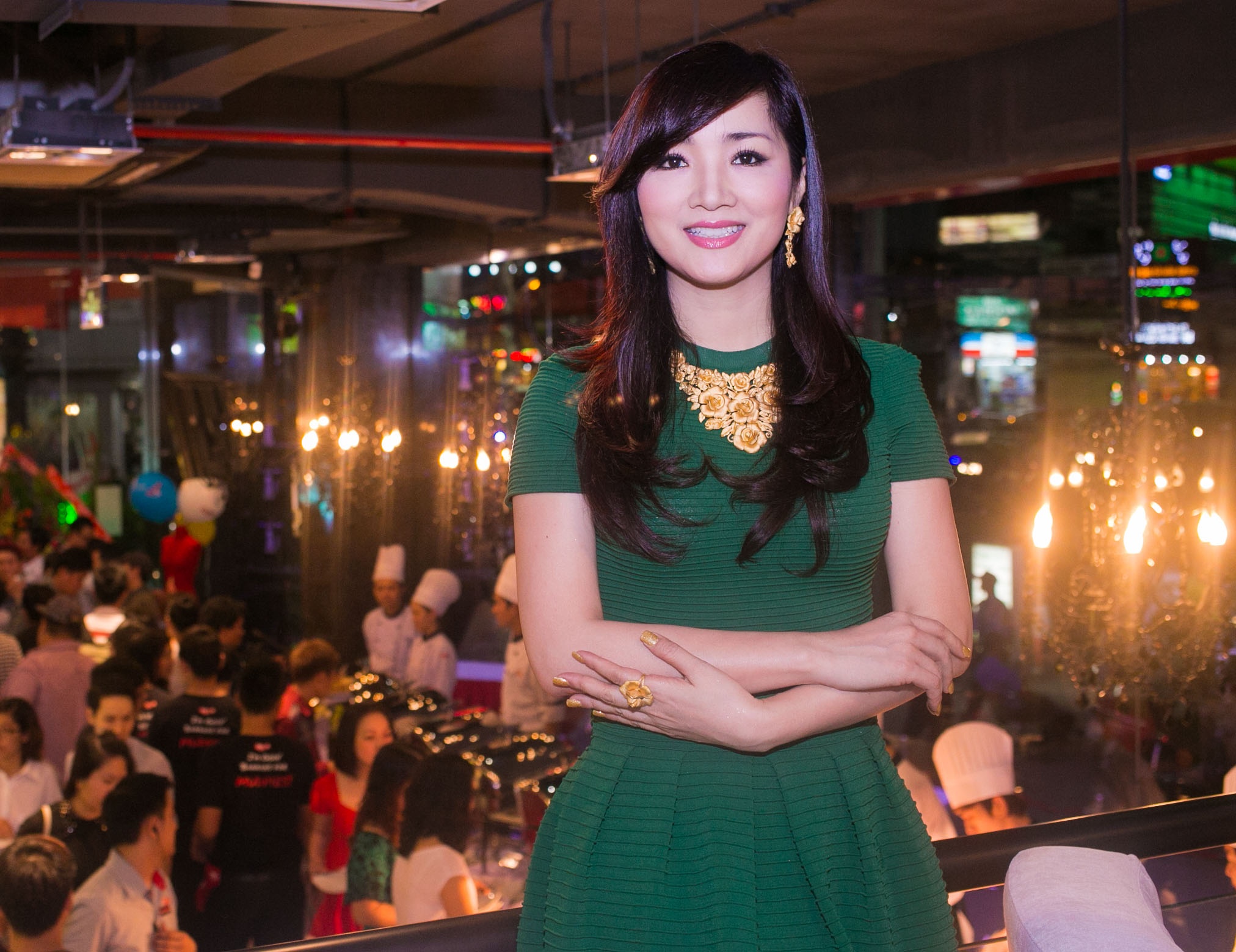 Chân dài Ngọc Quyên diện đầm đơn giản dự sự kiện, kết hợp cùng là mái tóc nhuộm màu nâu vàng để suôn thẳng đơn giản.
