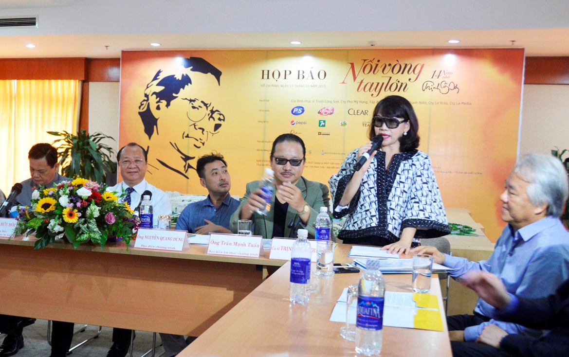 | Bà Trịnh Vĩnh Trinh cùng gia đình và các nghệ sĩ Nguyễn Quang Dũng, Trần Mạnh Tuấn tại buổi họp báo. |