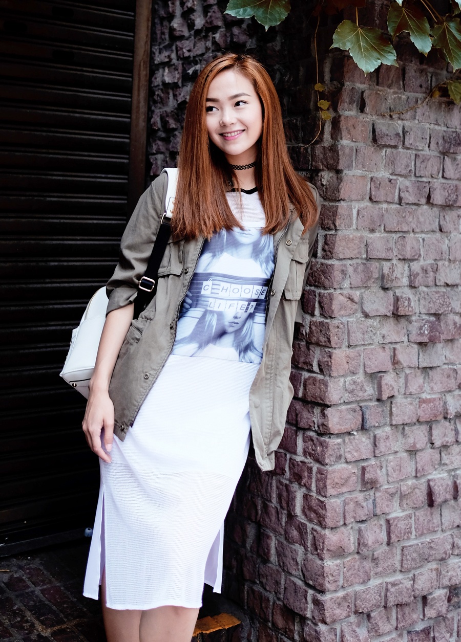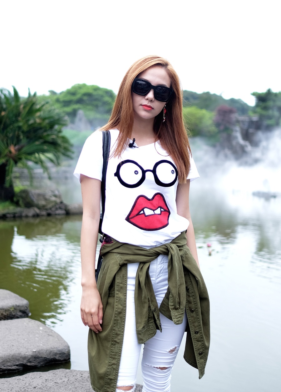 | Áo thun họa tiết làm điểm nhấn nhá cho set trang phục sắc trắng. Áo sơ-mi màu quân đội cột ngang hông tinh nghịch, được nhiều tín đồ thời trang lăng xê trong thời gian qua. |
