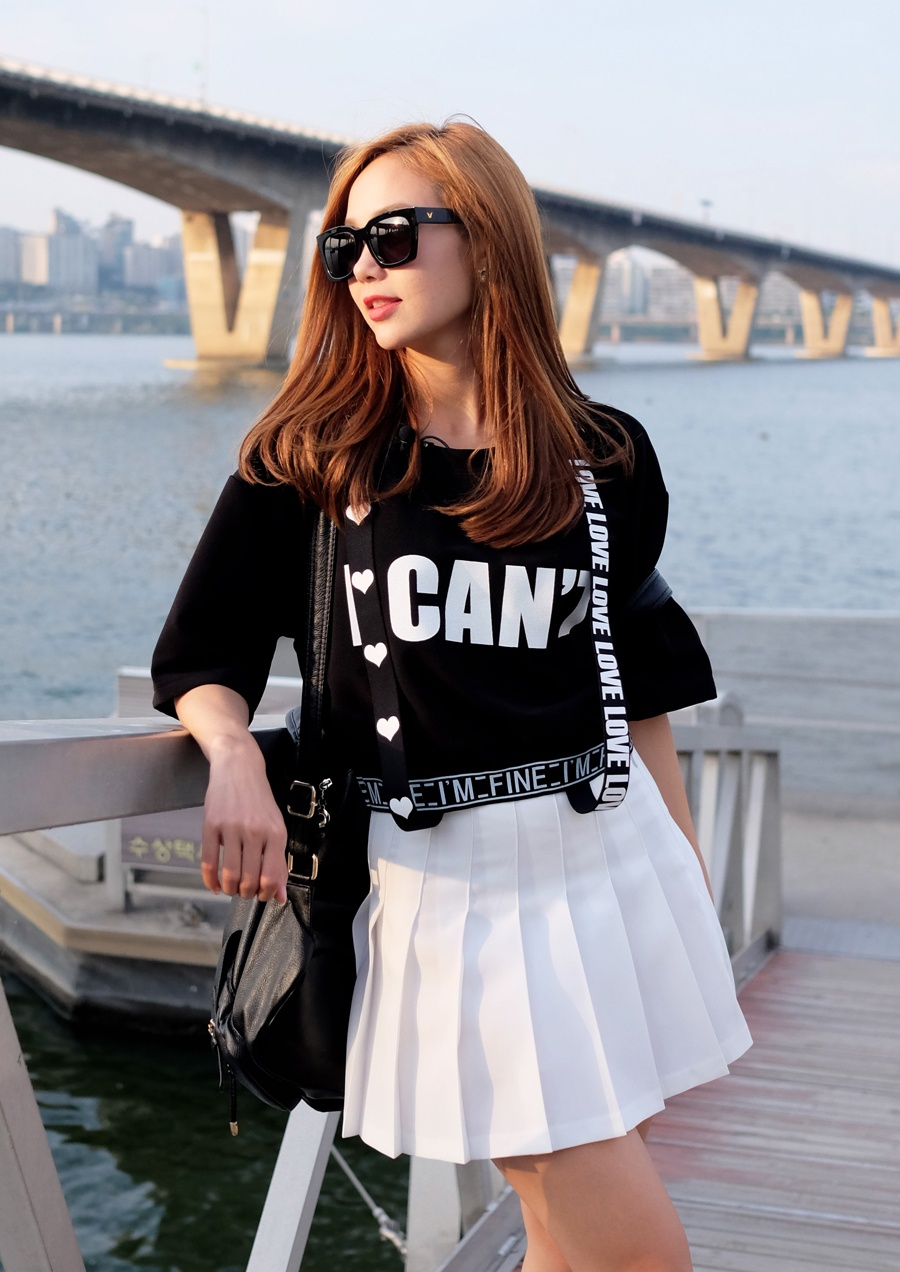 | Nữ ca sĩ, diễn viên chọn váy xếp ly phối cùng áo thun crop-top in chữ.. |