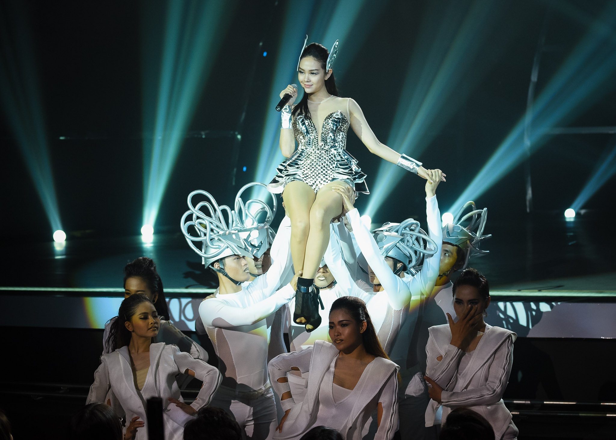 Người đẹp xuất hiện từ hàng ghế khán giả làm nhiều người bất ngờ. Cô tự tin trình diễn ca khúc Yolo nằm trong dự án mới nhất. |