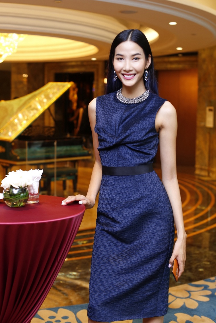 Thiết kế đầm kín đáo, chất liệu vải xốp tôn vóc dáng thanh mảnh của Hoàng Thùy tại sự kiện ra mắt sản phẩm công nghệ. Bộ cánh phom dáng cổ điển còn đưa nữ người mẫu vào nhóm sao mặc tinh tế trong tuần. Cách chọn trang sức, trang điểm, và tóc rẽ ngôi cũng ăn nhập hình ảnh sang trọng.