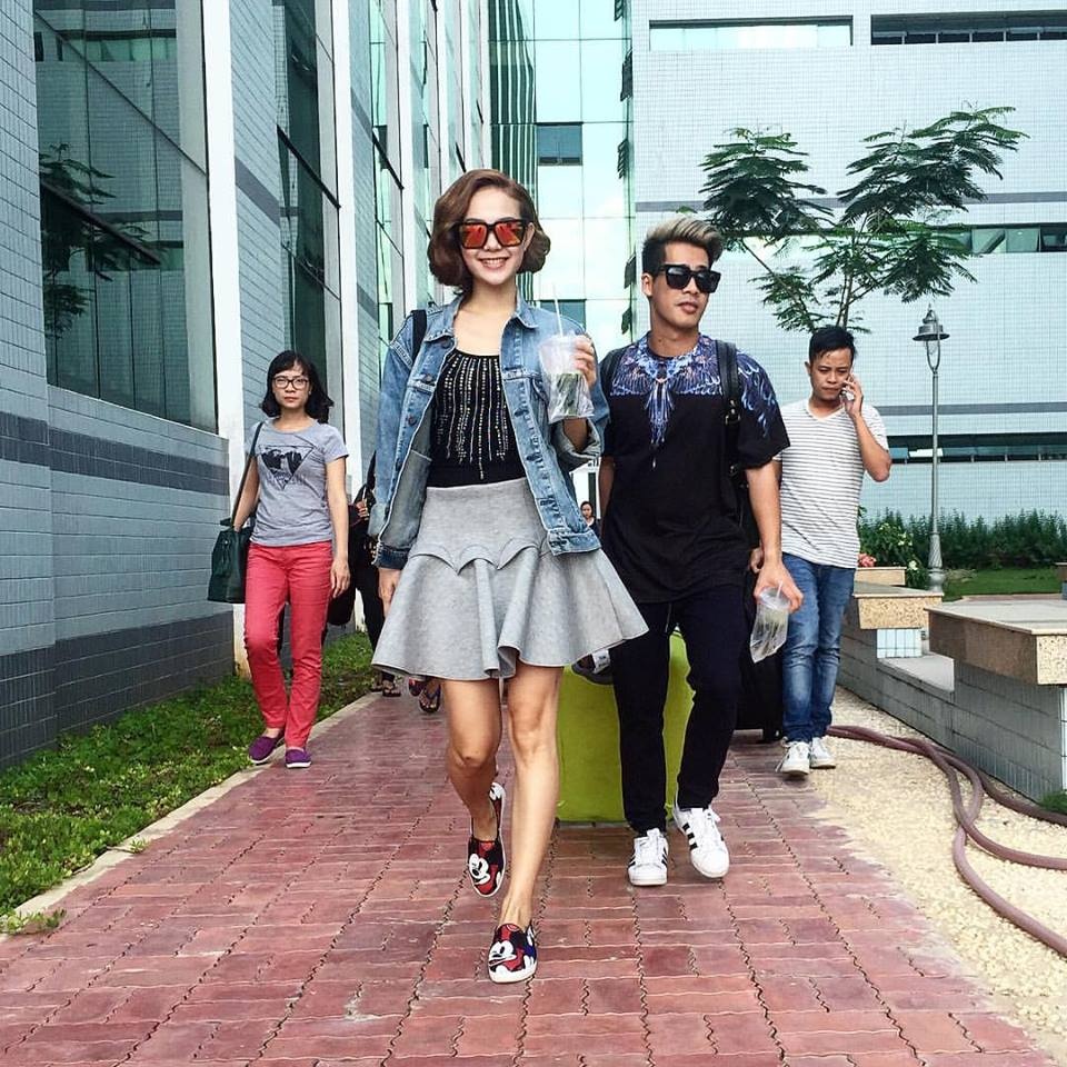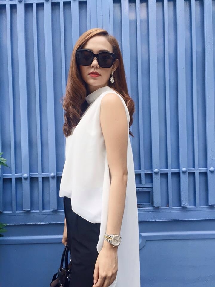 | Tóc ngang vai uốn sóng được Minh Hằng lựa chọn khi xuống phố nhưng nó khiến cô già dặn hơn. |