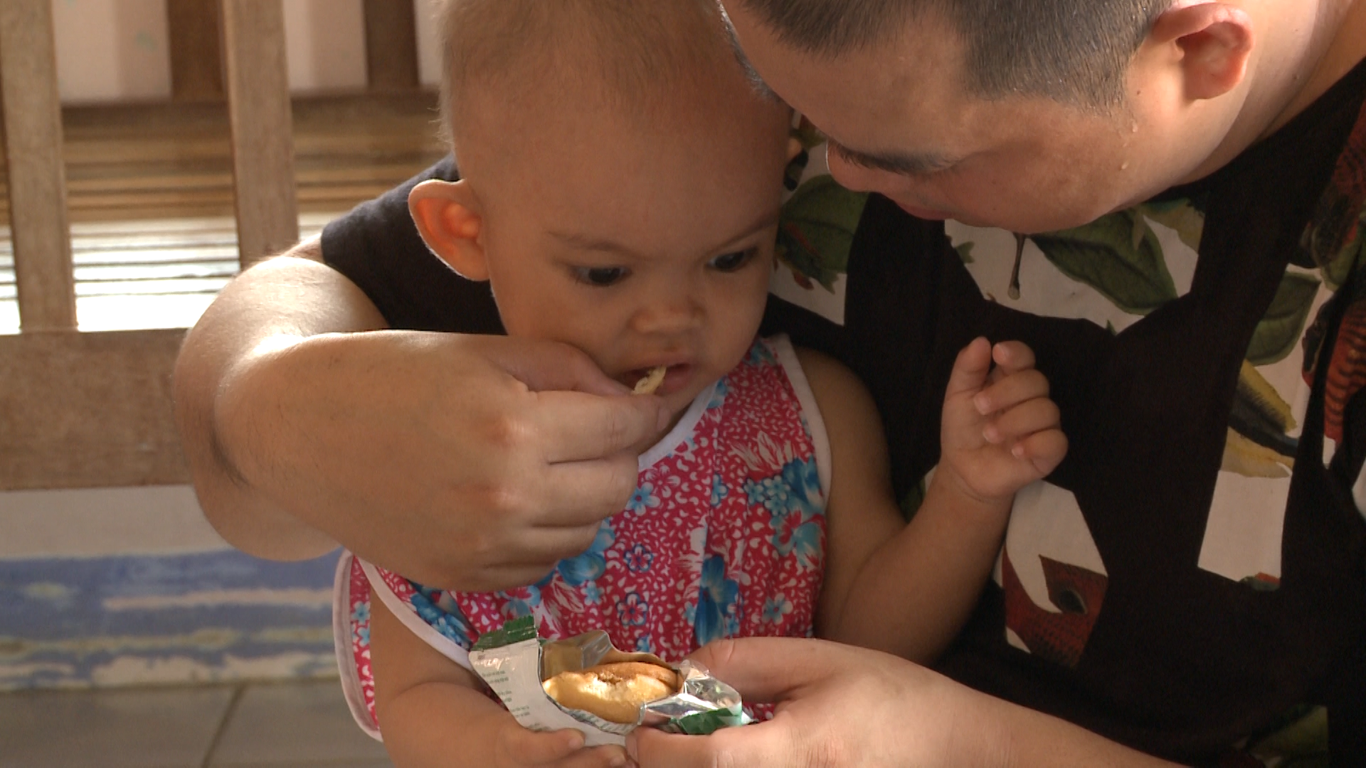 | Suti có cơ hội học làm chị khi được ca sĩ Hoàng Bách hướng dẫn cách xúc đồ ăn cho em. |