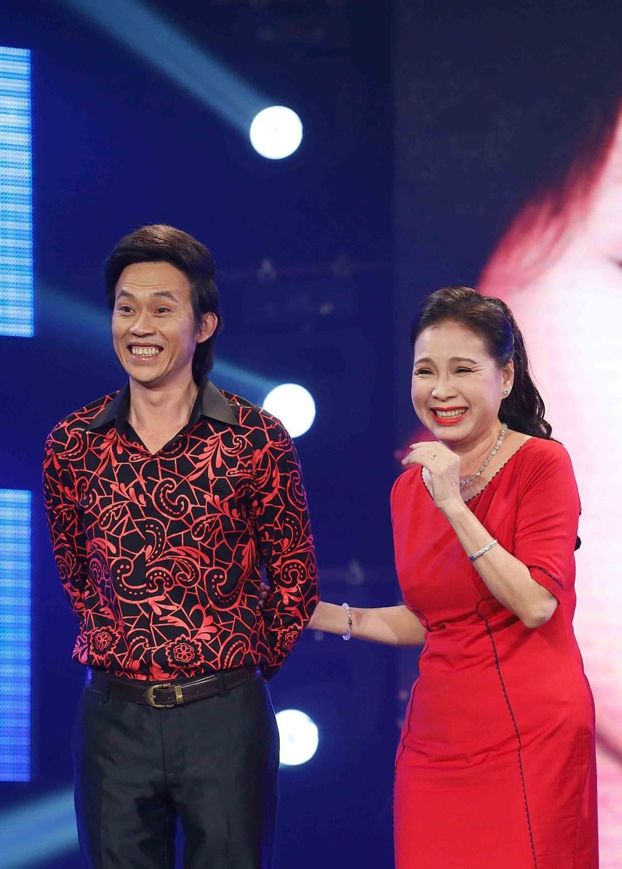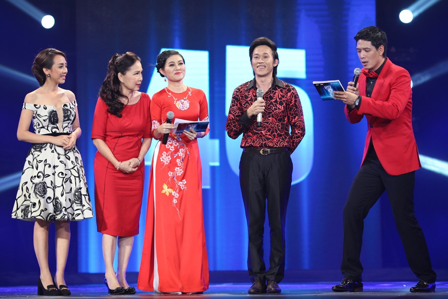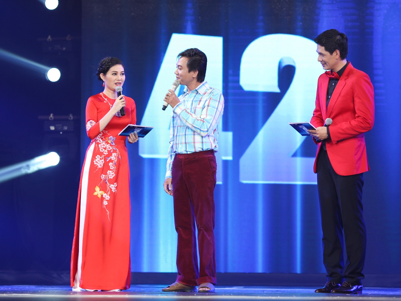 Cởi áo mão cân đai, NSƯT Quế Trân thướt tha trong bộ áo dài đỏ hợp tông với MC Bình Minh để trò chuyện cùng các nghệ sĩ trong top 3. Mỗi nghệ sĩ đã có những chia sẻ đầy thú vị về chặng đường đến với nghiệp diễn của họ.