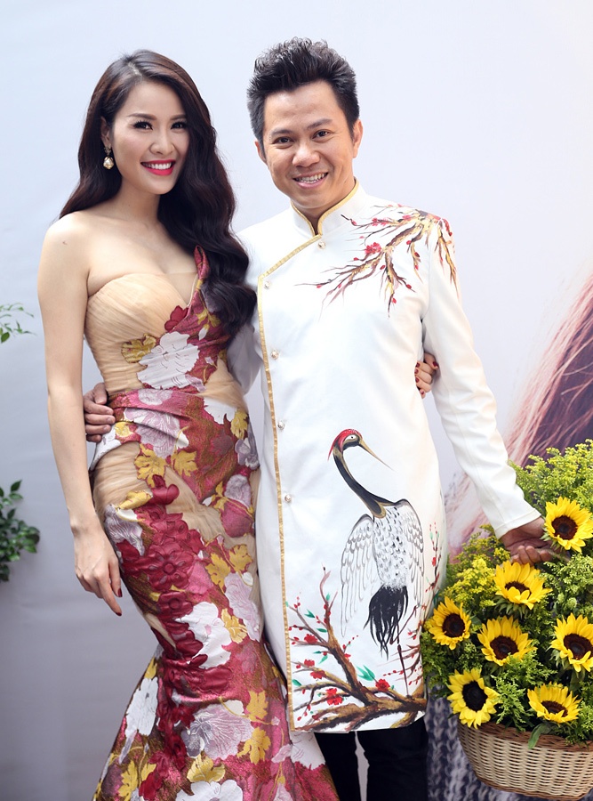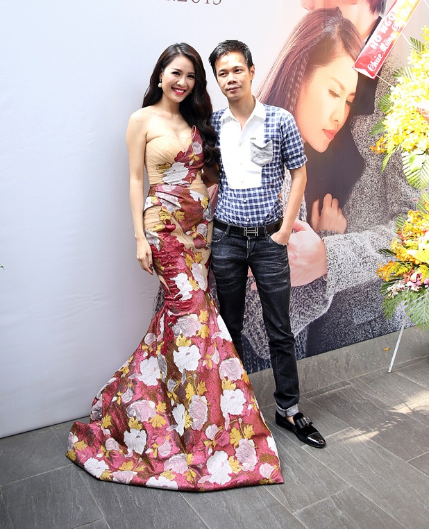 | Nhà thiết kế Hoàng Hải cũng đến mừng người đẹp. Chiếc đầm lộng lẫy cô diện cũng được anh thiết kế riêng cho vóc dáng của Quế Vân. |