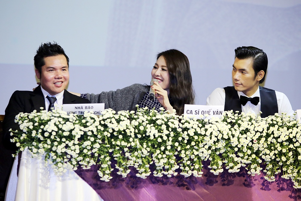 | Nhan Phúc Vinh bảnh bao, chăm sóc Quế Vân suốt buổi họp báo. Anh cũng là nam chính trong MV Đi qua thương nhớ của cựu người mẫu. |