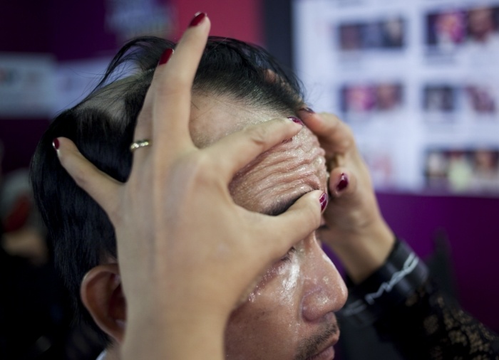 | Minh Thuận được các chuyên viên trang điểm cẩn trọng tạo các nếp nhăn trên gương mặt. |
