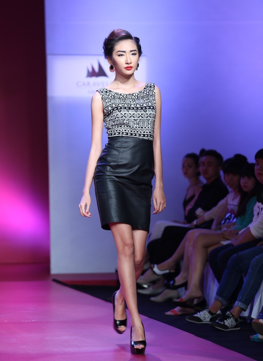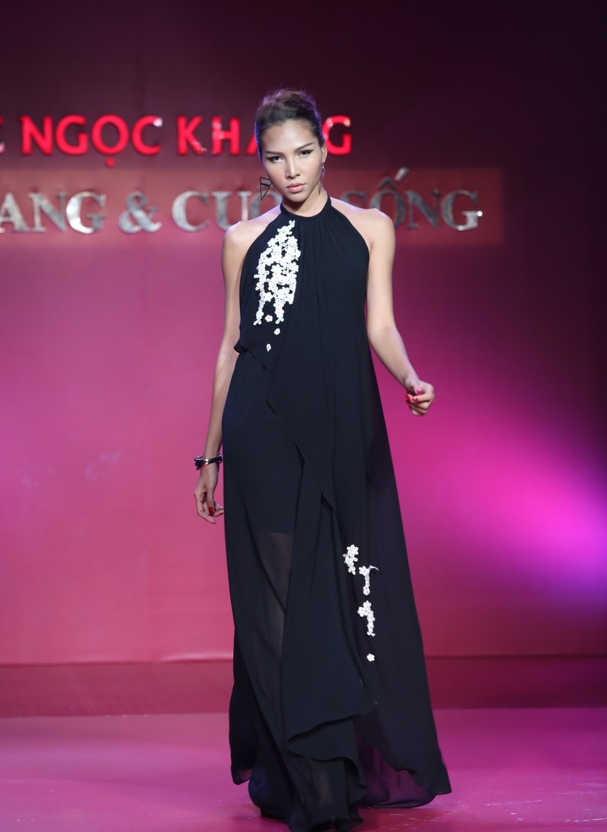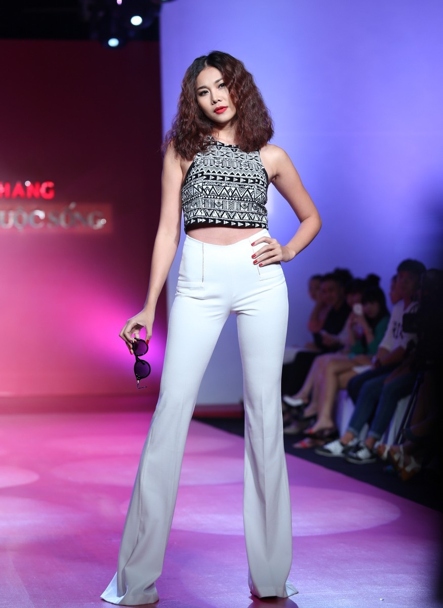Nữ người mẫu da nâu để lộ một bên lườn táo bạo với mốt áo lưng trần gợi cảm, đảm nhận vai trò người mẫu catwalk chương trình Thời trang & Cuộc sống.