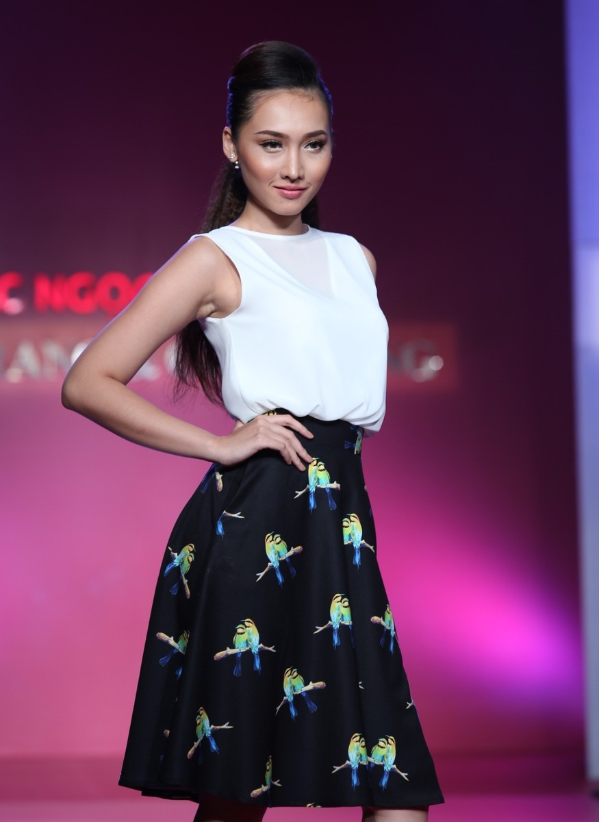 Vương Thu Phương nổi bật trên sàn diễn với phong cách trẻ trung. Gam màu đỏ cam làm nổi bật vóc dáng vừa giảm cân thành công của nữ người mẫu.