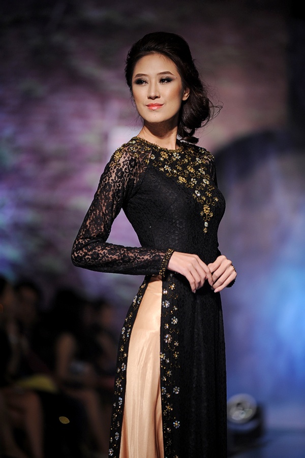| Tông màu đen mang lại nét duyên sang trọng cho người mặc. Thiết kế thêu đính hoa ở viền tà áo khá bắt mắt. |