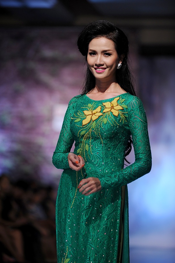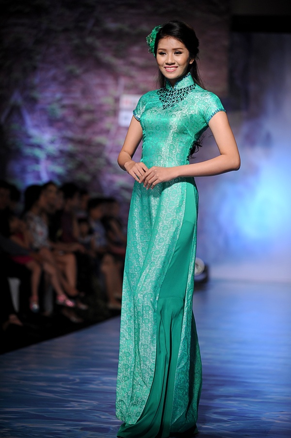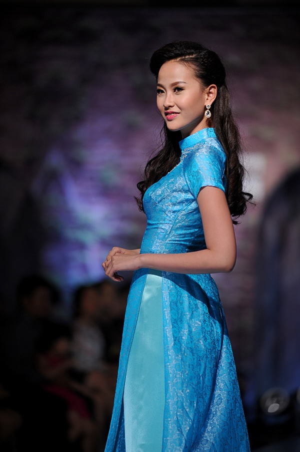| Ngọc Tình và bạn diễn phối hợp đồng điệu, trình diễn mẫu áo dài tông màu xanh ngọc ngọt ngào, sâu lắng. |
