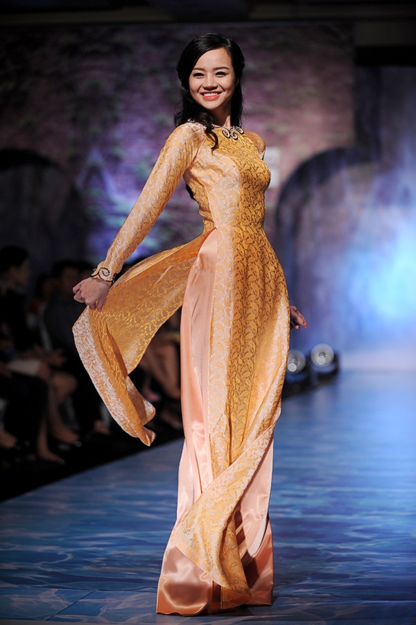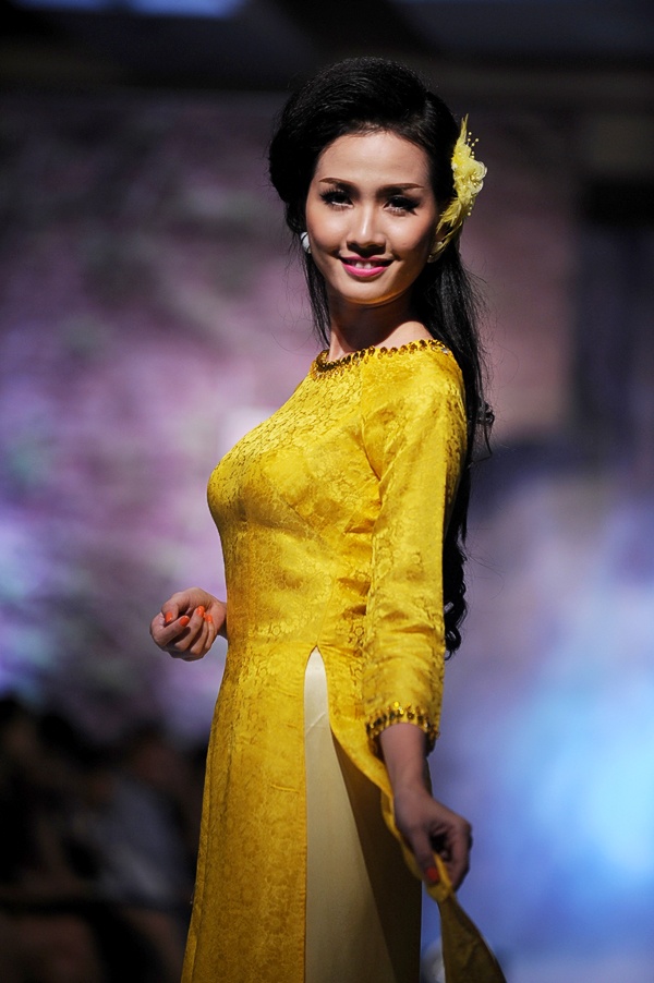 | Phan Thị Mơ thanh lịch và duyên dáng trong kiểu áo dài gấm tông màu vàng trẻ trung. |
