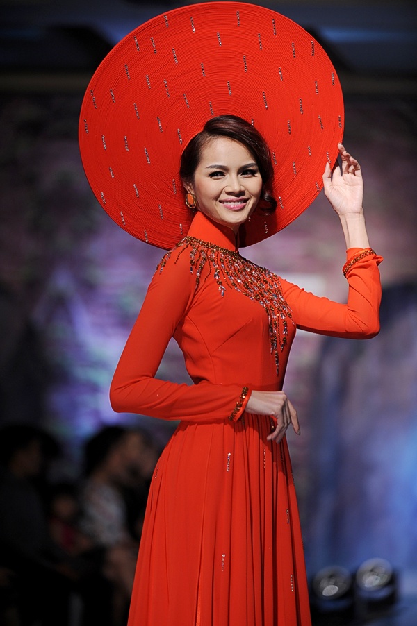 | Thu Hiền cá tính với áo dài gam trắng, kết hợp ăn ý cùng quần đỏ nổi bật. |