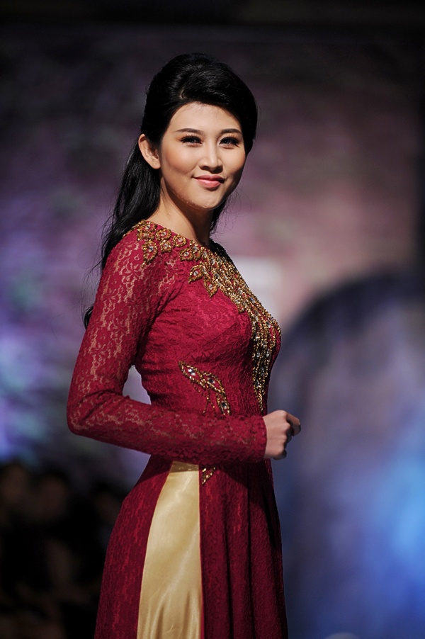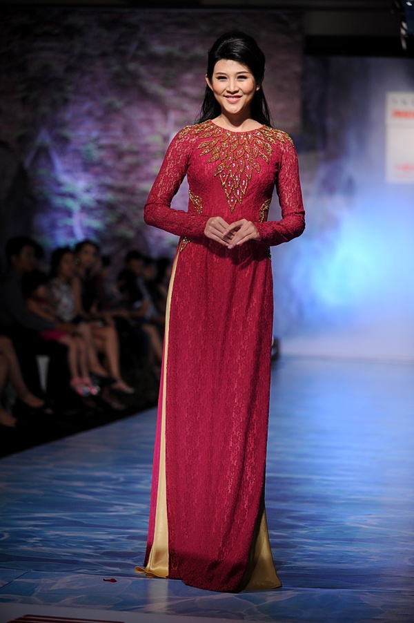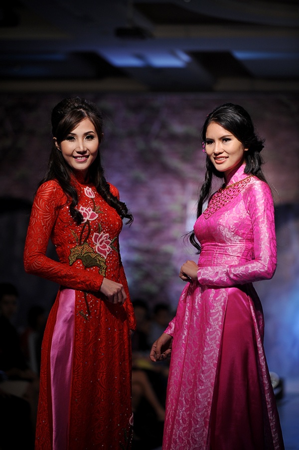 | Thu Kiều và Lê Thị Phương dịu dàng trong mẫu áo dài tông màu đỏ, hồng cánh sen bắt mắt. |