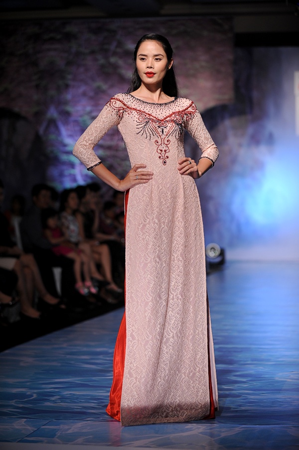 | Nữ người mẫu cá tính diện áo dài ren xuyên thấu của Cẩm Tú, đồng màu với trang phục của bạn diễn. Bộ đôi hóa thân thành cặp tân nương, tân lang tươi tắn và thanh lịch. Trong khi áo dài của "cô dâu" Minh Triệu đính kết ren tinh tế thì bộ cánh truyền thống của "chú rể" Trung Cương in họa tiết rồng phượng trên chất liệu lụa cổ điển. |